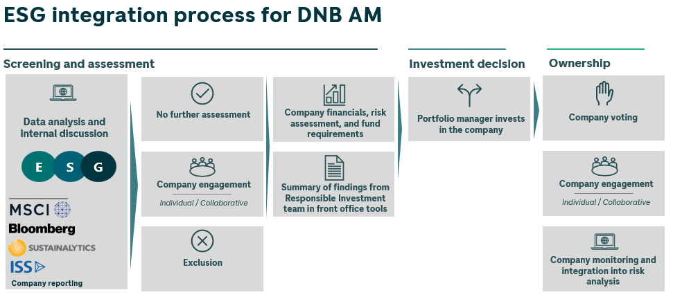 All active funds managed by DNB AM utilize integration of ESG risks and opportunities, although the process may differ between teams with different mandates. The Responsible Investment team works closely with all portfolio managers and key portfolio management teams are supported by a dedicated analyst from the responsible investment team for continuous oversight and support.