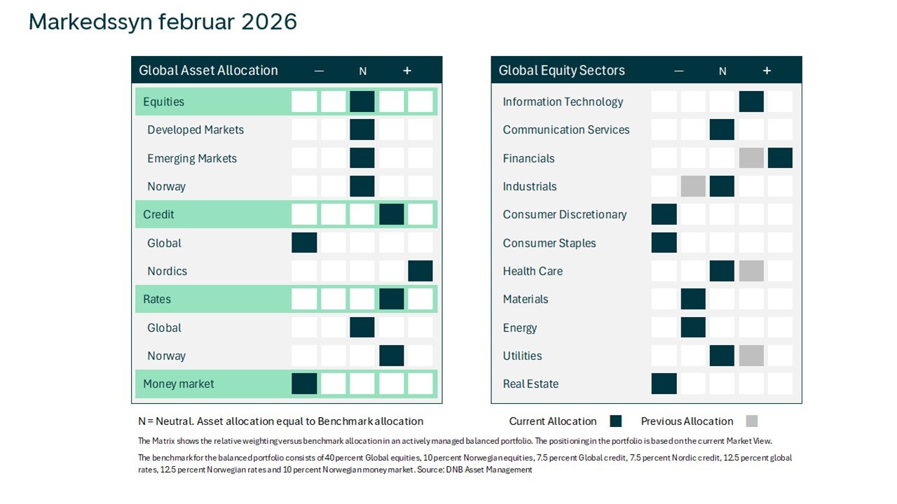 Overskriften reflekterer at 2026 har startet med mange og rare politiske utspill i fra en viss president, men at bevegelsene i verdipapirmarkedene har vært begrenset. Vi synes det også er logisk. Det er først når politikken påvirker konjunkturene samt pris- og renteutviklingen, at den blir relevant for verdipapirmarkedene. Her ser vi små effekter. Økonomisk vekst er stabil og prisveksten på vei nedover og vi beholder aksjer tett på nøytralvekt.